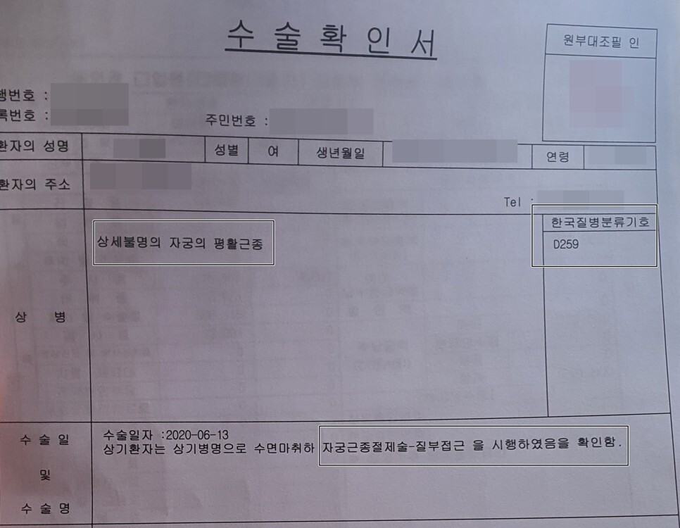 자궁근종으로 수술을 하셨는데 질병코드는 D259로 나왔습니다.