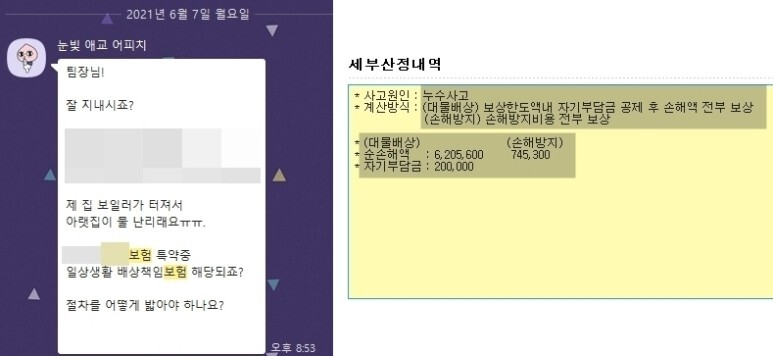 ✔ 가족일상 배상 책임 아래층 누수 사고 2021년 6월 7일 월요일 고객님에게서 연락이 왔습니다. 보일러가 터져서 아래층에 물난리가 났다는 연락이었습니다. 이럴 때 필요한 특약은? 가족일상